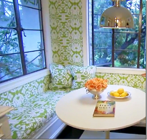 Mary Macdonald’s breakfast nook wallpapered in Quadrille’s Island Ikat.
